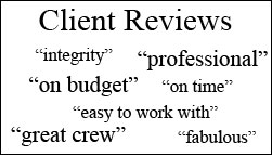 Throughout this site you'll see quotes from our clients, i.e., "Adam was great to work with, a true professional, and actually showed us how to save money on the project". Ruth & Ken